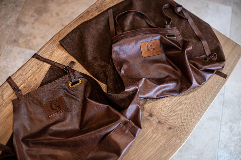 Ce tablier est fabriqué à la main avec un cuir souple. Vous pouvez le porter à la taille ou autour du cou avec sa bretelle réglable qui s’adapte à toutes les morphologies.